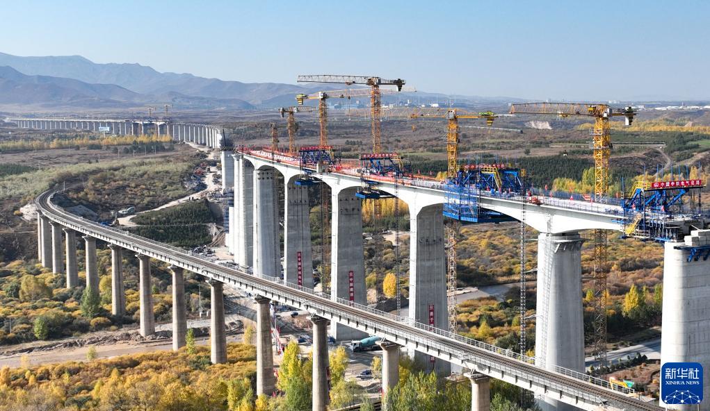 10月12日拍攝的集通鐵路電氣化改造工程多倫河特大橋剛構連續梁(無(wú)人機照片)。