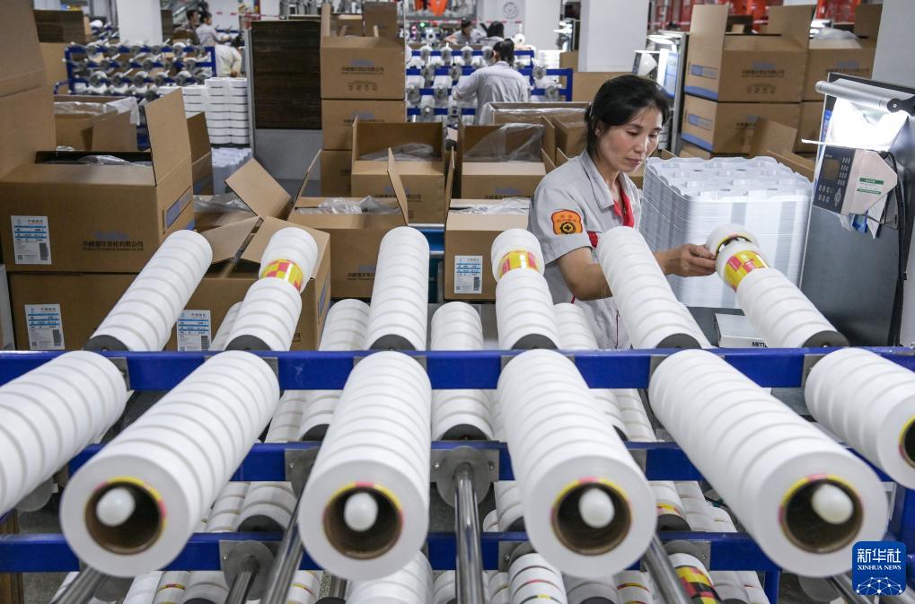 在位于重慶市涪陵區的重慶華峰新材料產(chǎn)業(yè)園氨綸生產(chǎn)車(chē)間,工作人員將制成的產(chǎn)品裝箱(10月10日攝)。