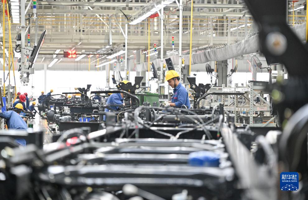9月26日,工作人員在重慶市兩江新區的上汽紅巖汽車(chē)有限公司總裝車(chē)間作業(yè)。