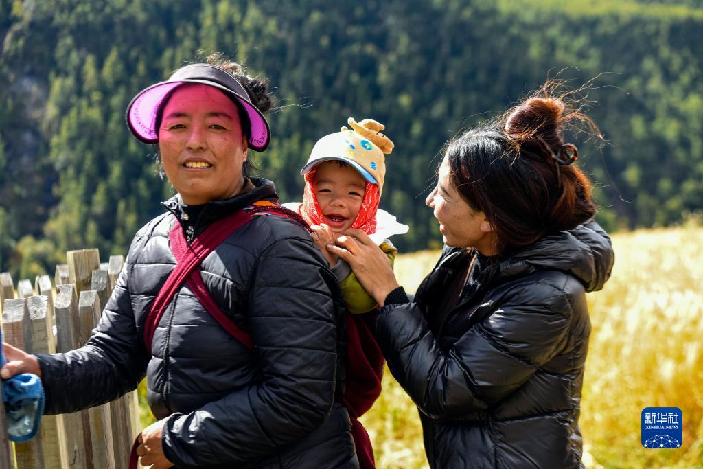 10月12日,在四川甘孜藏族自治州稻城縣亞丁村,村民澤仁拉姆(右)收割完青稞與村民四朗卓瑪(左)聊天。