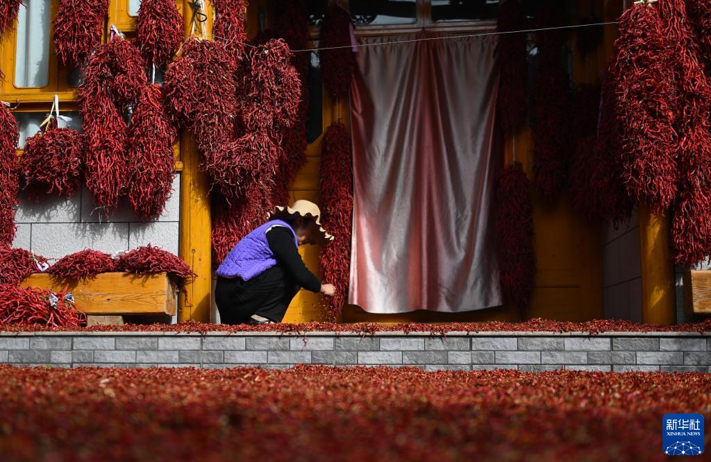 10月12日,在青海省海東市循化撒拉族自治縣清水鄉田蓋村,種植戶(hù)在晾曬線(xiàn)椒。