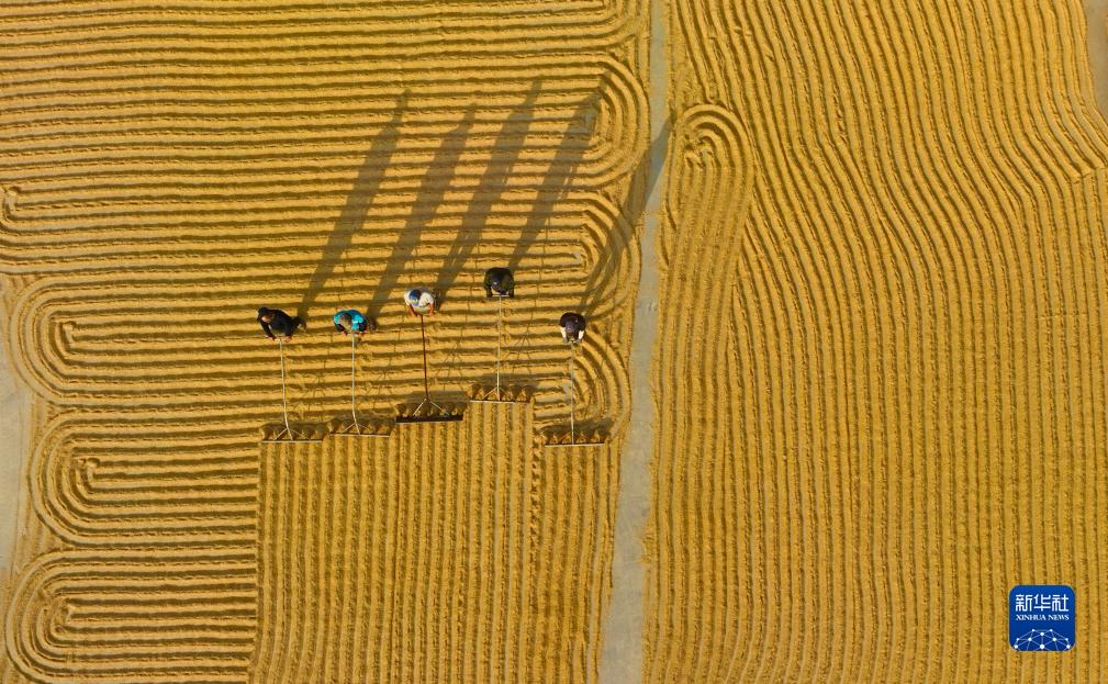 10月12日,在燈塔市禾谷茂源水稻種植專(zhuān)業(yè)合作社,農民在晾曬收獲的水稻(無(wú)人機照片)。