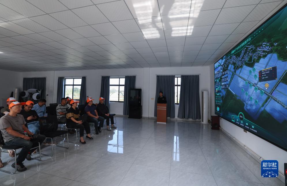 10月12日,在蟹臨門(mén)太湖蟹共富養殖基地內,工作人員給前來(lái)學(xué)習養殖經(jīng)驗的外地養殖戶(hù)介紹基地的情況。