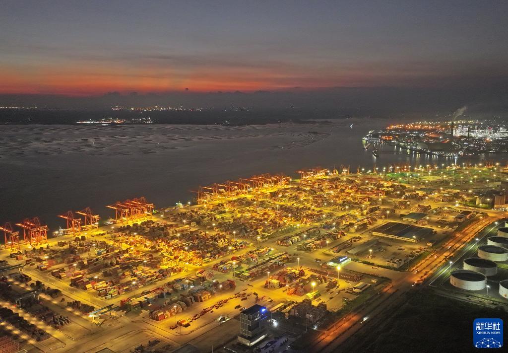 10月3日拍攝的欽州港碼頭夜景(無(wú)人機照片)。