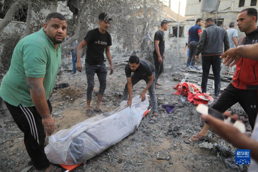10月12日,在加沙地帶南部城市汗尤尼斯,人們在遭以色列空襲后的建筑廢墟中抬出遇難者遺體。