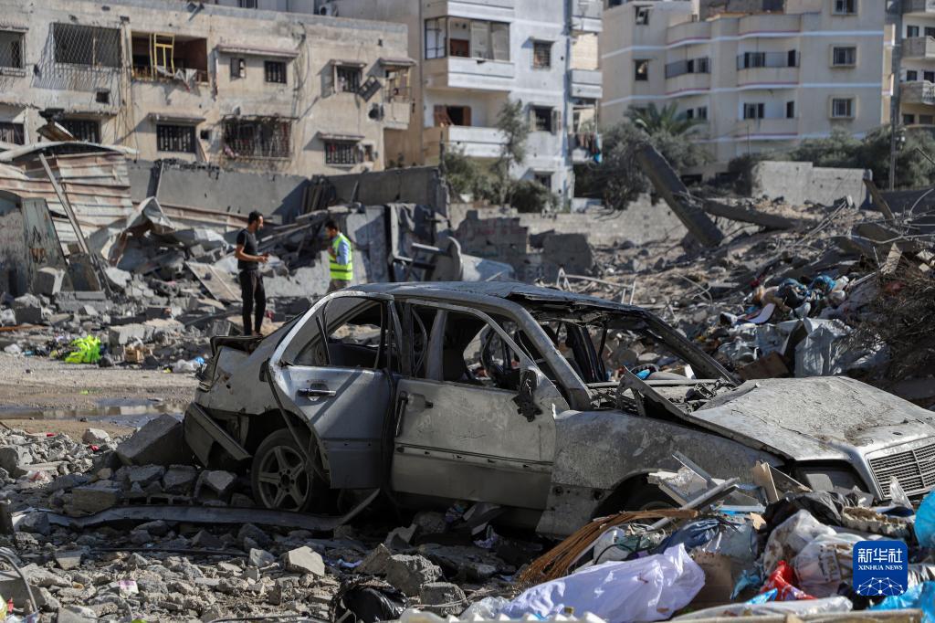 這是10月12日在加沙城拍攝的一輛被以色列軍隊空襲炸毀的汽車(chē)。