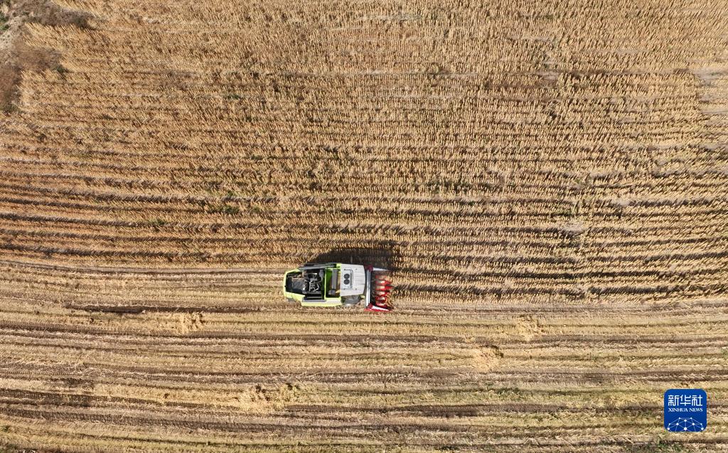 收割機在河北省沽源縣白土窯鄉陳家營(yíng)村田地里收割藜麥(10月12日攝,無(wú)人機照片)。