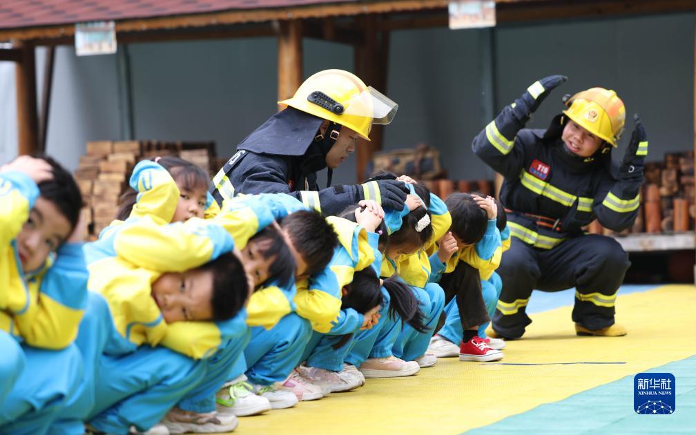 10月13日,消防員在貴州省銅仁市玉屏侗族自治縣實(shí)驗幼兒園指導小朋友在防震演練中緊急避險。
