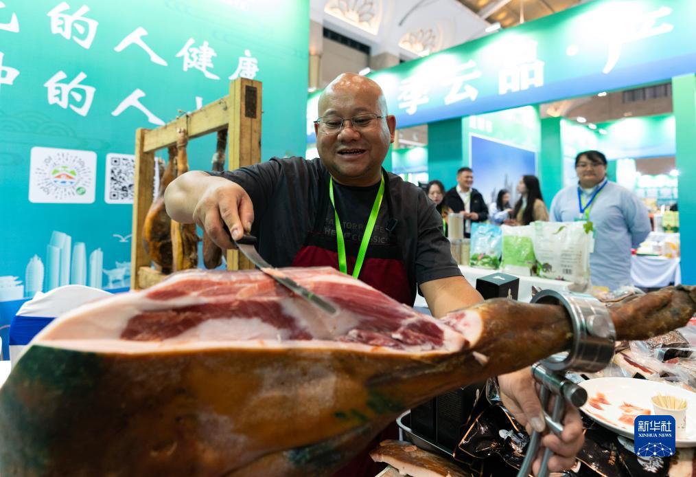 10月13日,一名參展商在云南國際餐飲美食暨預制菜產(chǎn)業(yè)博覽會(huì )上切諾鄧火腿。