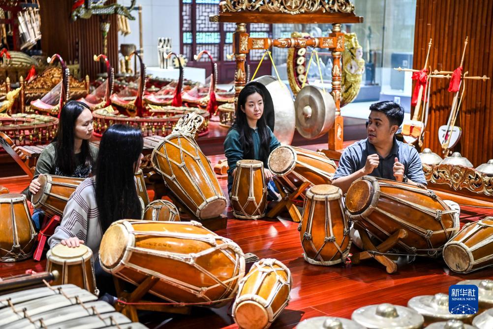 10月12日,在廣西藝術(shù)學(xué)院,仁迪(右一)給學(xué)生講解演奏知識。