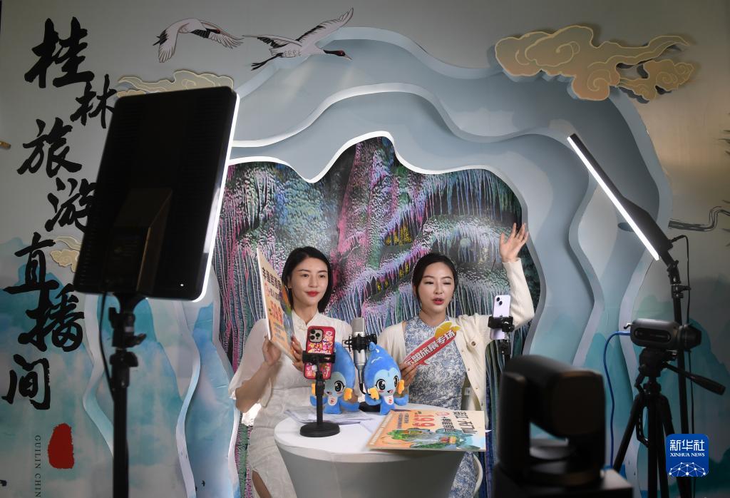 10月13日,在廣西桂林新國際會(huì )展中心,兩名女子在旅游展上通過(guò)網(wǎng)絡(luò )直播推介旅游產(chǎn)品。