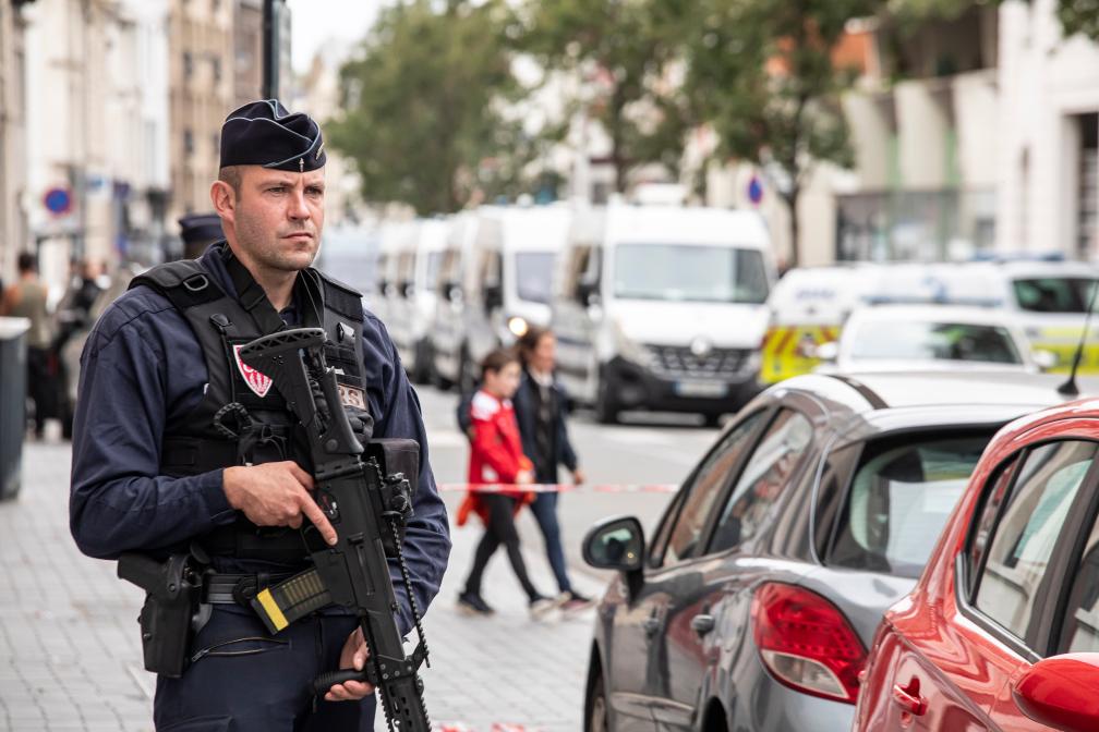 10月13日,在法國北部城市阿拉斯,警察在發(fā)生襲擊事件的甘貝塔高中附近警戒。
