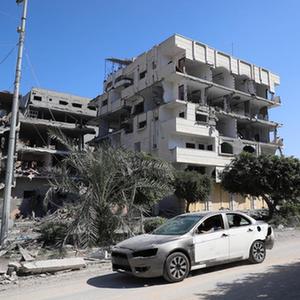 這是10月13日在加沙城拍攝的遭以色列空襲損毀的建筑。