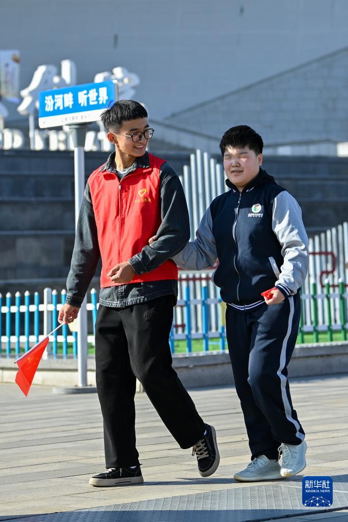 10月13日,志愿者和盲校學(xué)生在太原汾河公園交流。