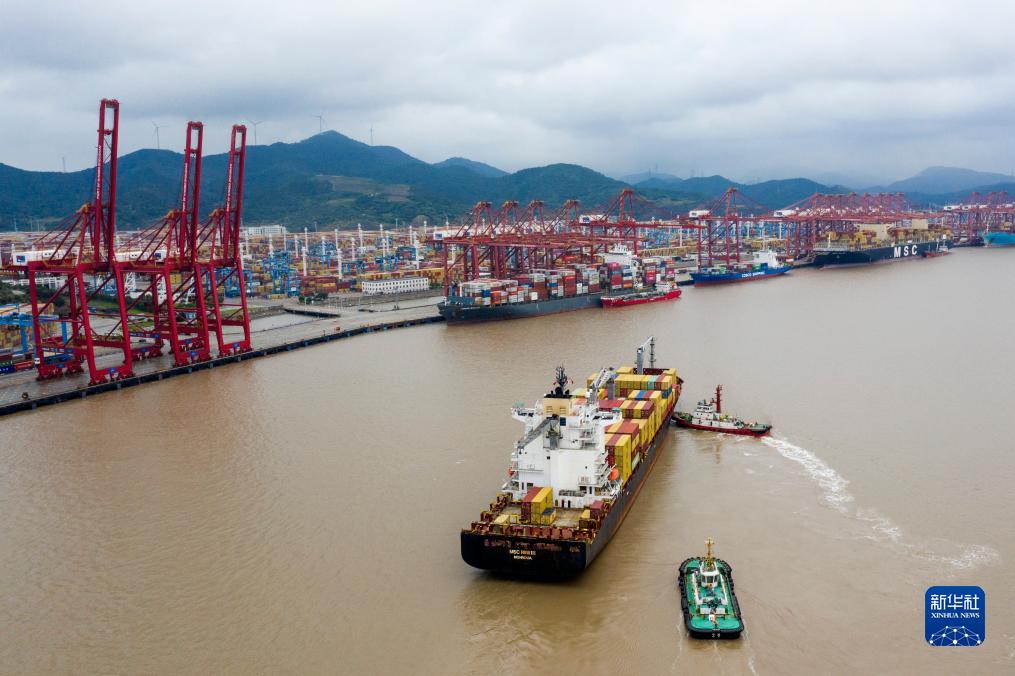 在浙江省寧波舟山港穿山港區集裝箱碼頭海域,“地中海琳妮三號”(MSC RINI Ⅲ)輪在拖輪的助力下緩緩靠泊(無(wú)人機照片,9月21日攝)。