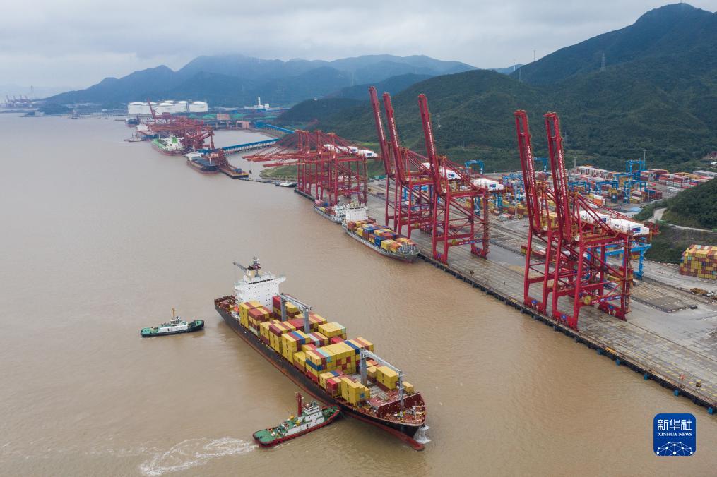 在浙江省寧波舟山港穿山港區集裝箱碼頭海域,“地中海琳妮三號”(MSC RINI Ⅲ)輪在拖輪的助力下緩緩靠泊(無(wú)人機照片,9月21日攝)。