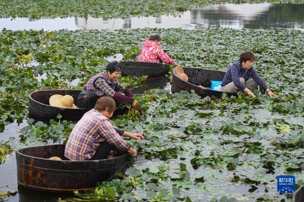10月14日,在南潯區和孚鎮新荻村菱塘,村民劃著(zhù)菱桶采摘菱角。