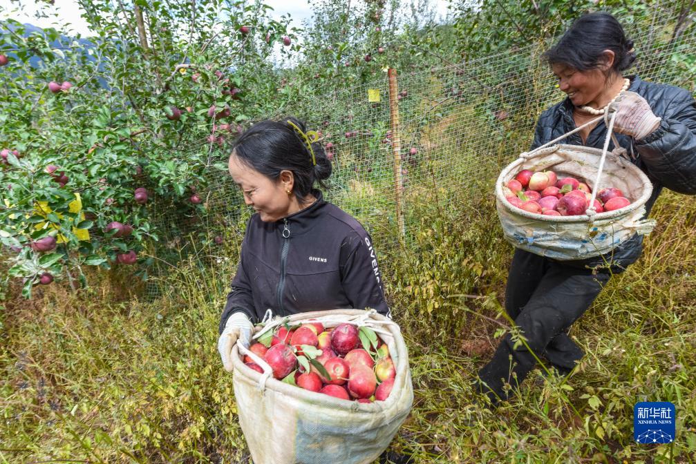 10月13日,在鄉城縣“蘋(píng)果+藏豬”種養循環(huán)現代農業(yè)園區內的有機蘋(píng)果種植示范基地,當地藏族群眾太(左)和洛絨抱著(zhù)采摘的蘋(píng)果下山。