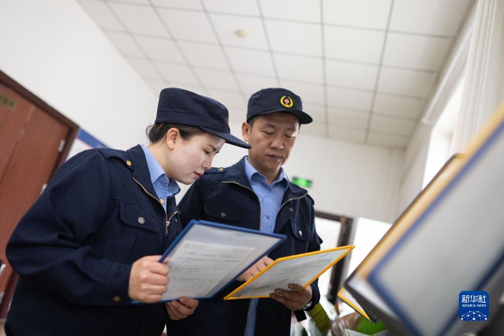 10月12日,在中國鐵路青藏集團有限公司西寧東車(chē)輛段制動(dòng)班組,馬婷(左)與工長(cháng)交流檢修經(jīng)驗。