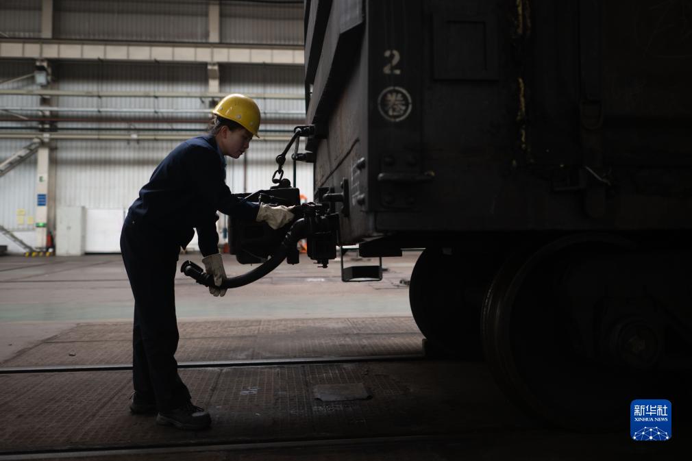 10月12日,在中國鐵路青藏集團有限公司西寧東車(chē)輛段制動(dòng)班組,馬婷在檢查貨車(chē)車(chē)輛制動(dòng)軟管。