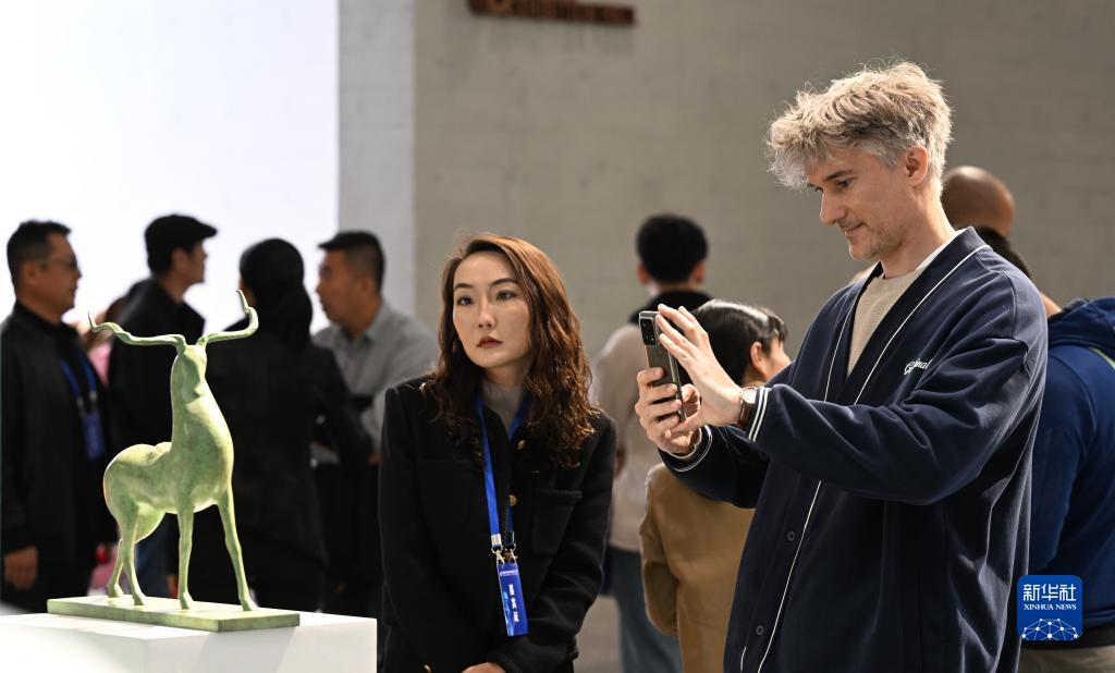 10月14日,觀(guān)眾在首屆呼和浩特國際雕塑藝術(shù)展上拍攝雕塑作品。