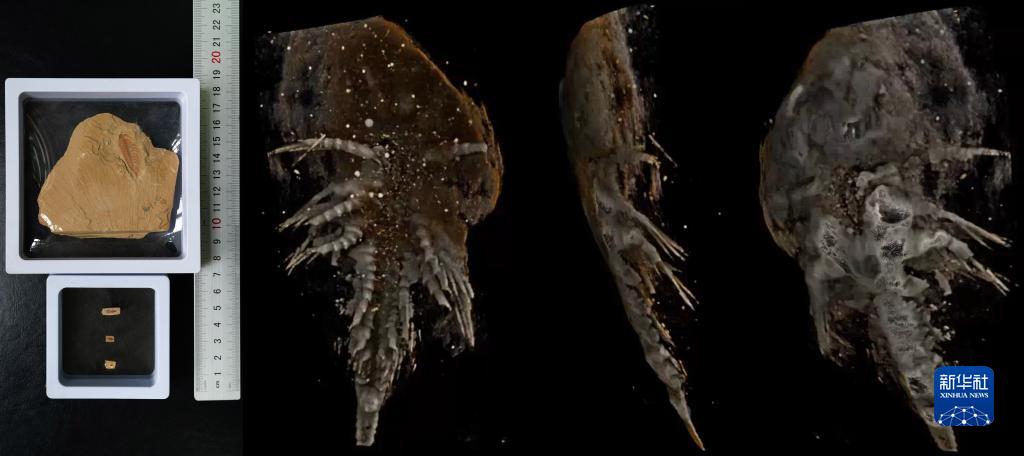 這是一張拼版照片,左邊為不同生長(cháng)時(shí)期的迷人林喬利蟲(chóng)化石,右邊為云南大學(xué)古生物研究院研究員劉煜團隊拍攝的迷人林喬利蟲(chóng)不同方位的CT片(10月11日攝)。