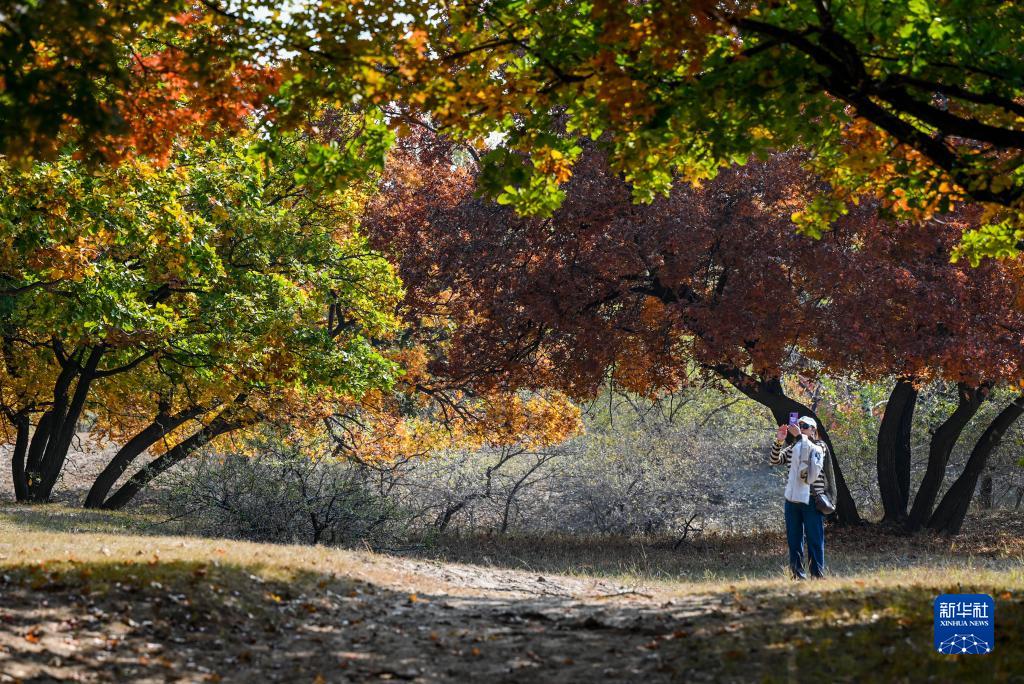 10月14日,游人在烏旦塔拉五角楓森林公園拍照。