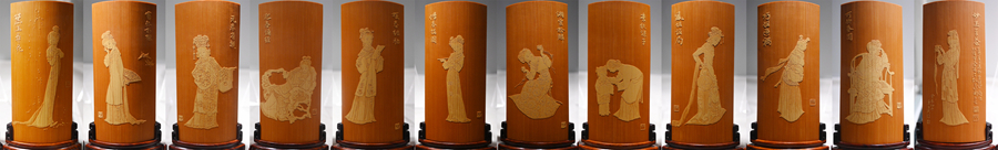 10月14日拍攝的劉旦宅畫(huà)、徐秉方刻的留青竹刻臺屏作品“金陵十二釵”(拼版照片)。