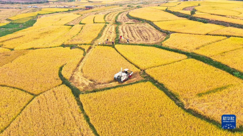 10月13日,湖南省郴州市桂陽(yáng)縣歐陽(yáng)海鎮的農民駕駛農機在收割晚稻(無(wú)人機照片)。
