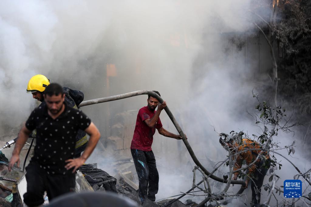 10月14日,在加沙地帶南部城市汗尤尼斯,人們在撲滅以色列空襲造成的火災。