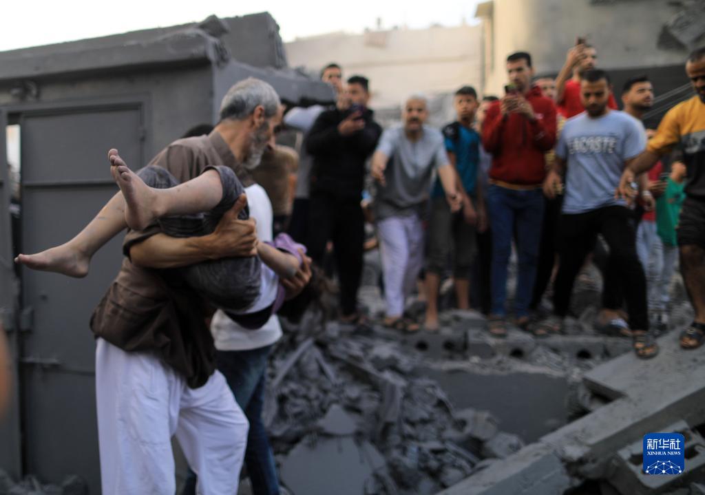 10月14日,在加沙地帶南部城市汗尤尼斯,人們在遭以色列空襲炸毀的建筑中救援。