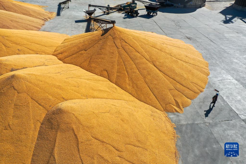 10月15日,在內蒙古通遼市科爾沁左翼中旗腰林毛都鎮一家“糧食銀行”,工人走在烘干后的玉米堆前(無(wú)人機照片)。
