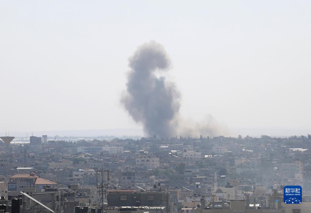 10月15日,在加沙地帶南部城市拉法,建筑遭以色列空襲后冒出濃煙。