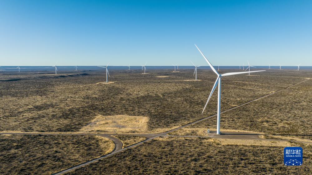 這是6月12日在阿根廷丘布特省馬德林港拍攝的羅馬布蘭卡一期風(fēng)電場(chǎng)(航拍照片)。