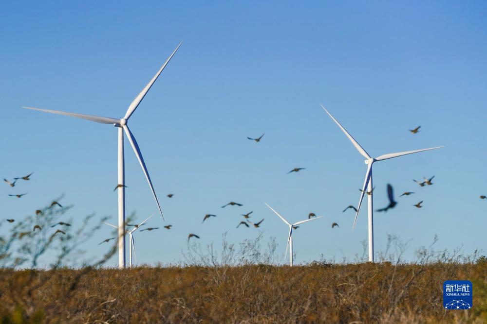 這是6月12日在阿根廷丘布特省馬德林港拍攝的羅馬布蘭卡一期風(fēng)電場(chǎng)。
