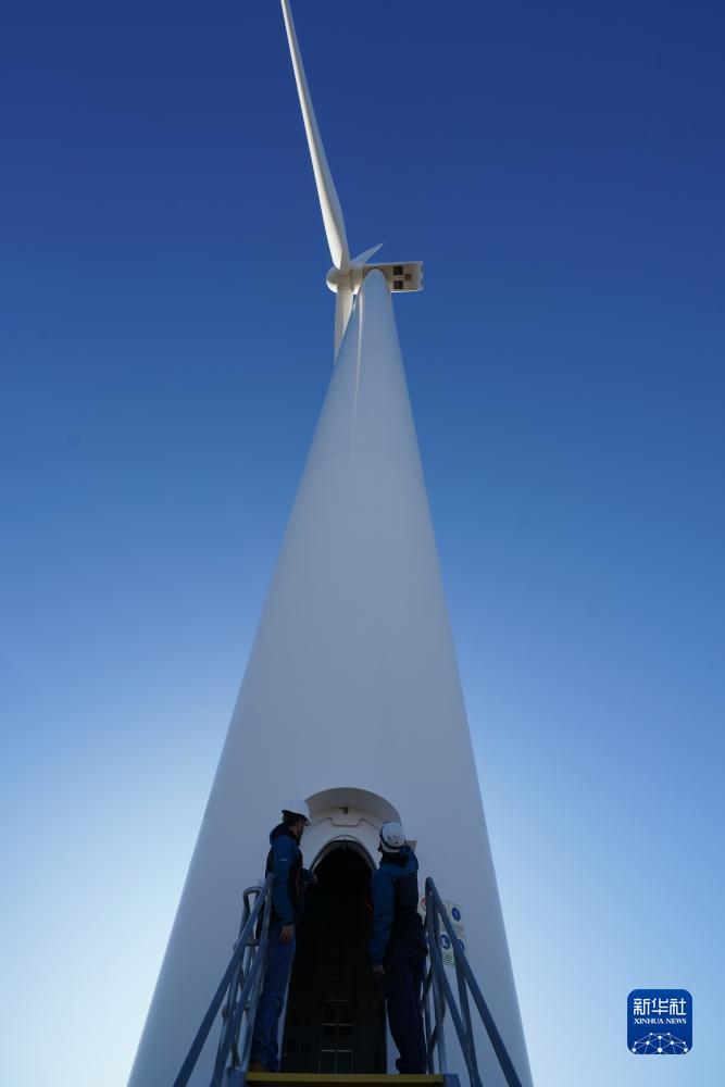 6月12日,在阿根廷丘布特省馬德林港的羅馬布蘭卡一期風(fēng)電場(chǎng),風(fēng)機運維人員檢查設備運行狀況。