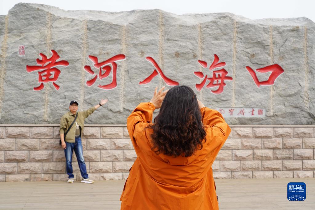 10月12日,游客在黃河入??诖a頭拍照留念。