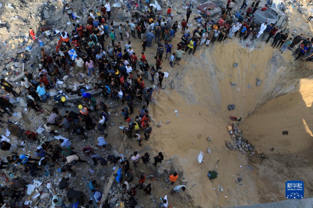 10月16日,在加沙地帶南部城市汗尤尼斯,人們在遭以色列襲擊后的建筑廢墟中救援傷者。