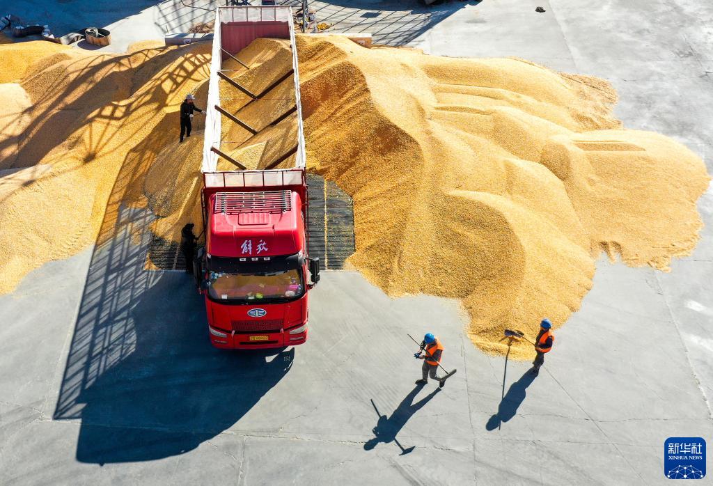 10月15日,司機駕駛運糧車(chē)在通遼市科爾沁左翼中旗腰林毛都鎮收糧站卸糧(無(wú)人機照片)。