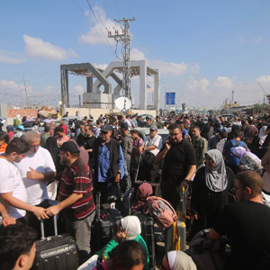 10月16日,人們在加沙地帶南部的拉法口岸前等待撤離加沙地帶。
