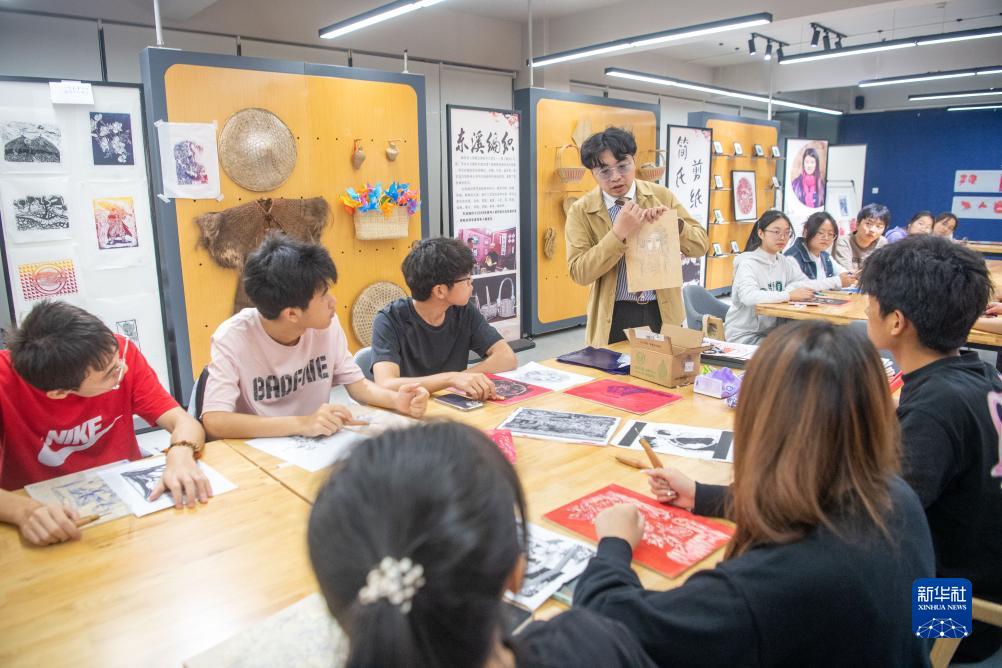 在重慶移通學(xué)院“綦河書(shū)院”的巴渝文化工作室內,老師在教授學(xué)生學(xué)習重慶市級非遺綦江農民版畫(huà)的制作。