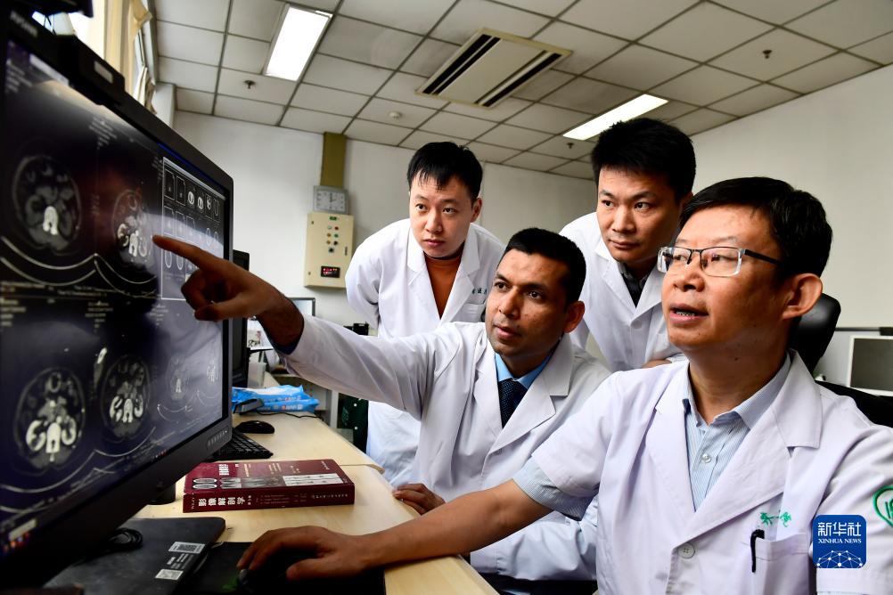 10月16日,在山東大學(xué)齊魯醫院放射科閱片室,默罕默德·沙巴茲(左二)向博士后合作導師于德新(右一)請教CT片問(wèn)診知識。