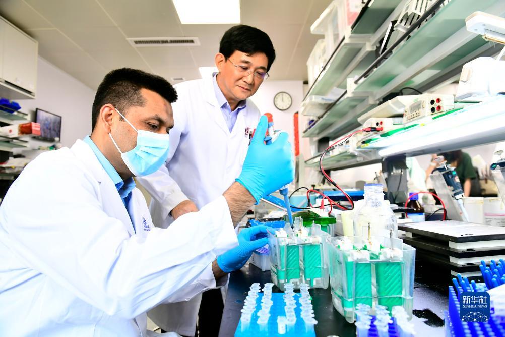 10月16日,在山東大學(xué)齊魯醫學(xué)院腫瘤研究聯(lián)合實(shí)驗室,默罕默德·沙巴茲(左)在做實(shí)驗。