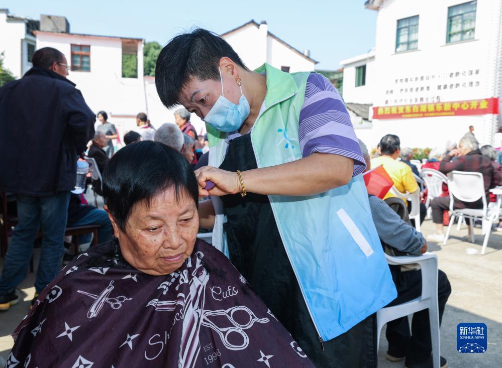 10月17日,志愿者(右)在東白湖鎮樂(lè )齡中心給老人理發(fā)。