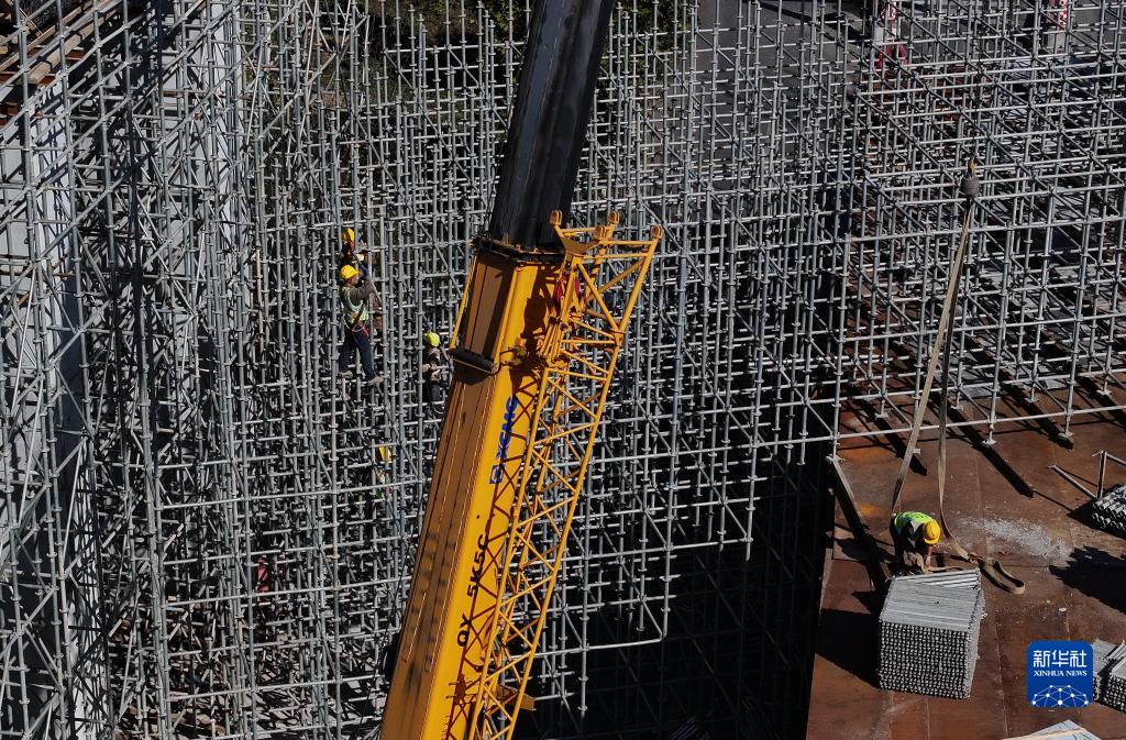 10月17日,工人在唐山灤州市內的秦唐高速公路建設工地施工(無(wú)人機照片)。
