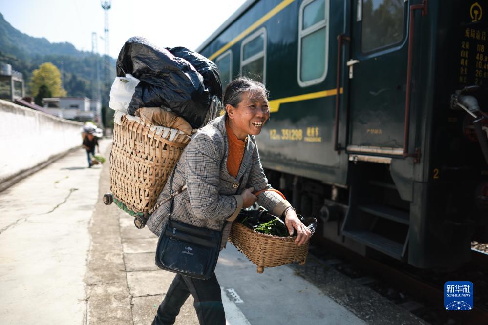 10月17日,村民攜帶農產(chǎn)品在婁山關(guān)站登上5630次列車(chē)。