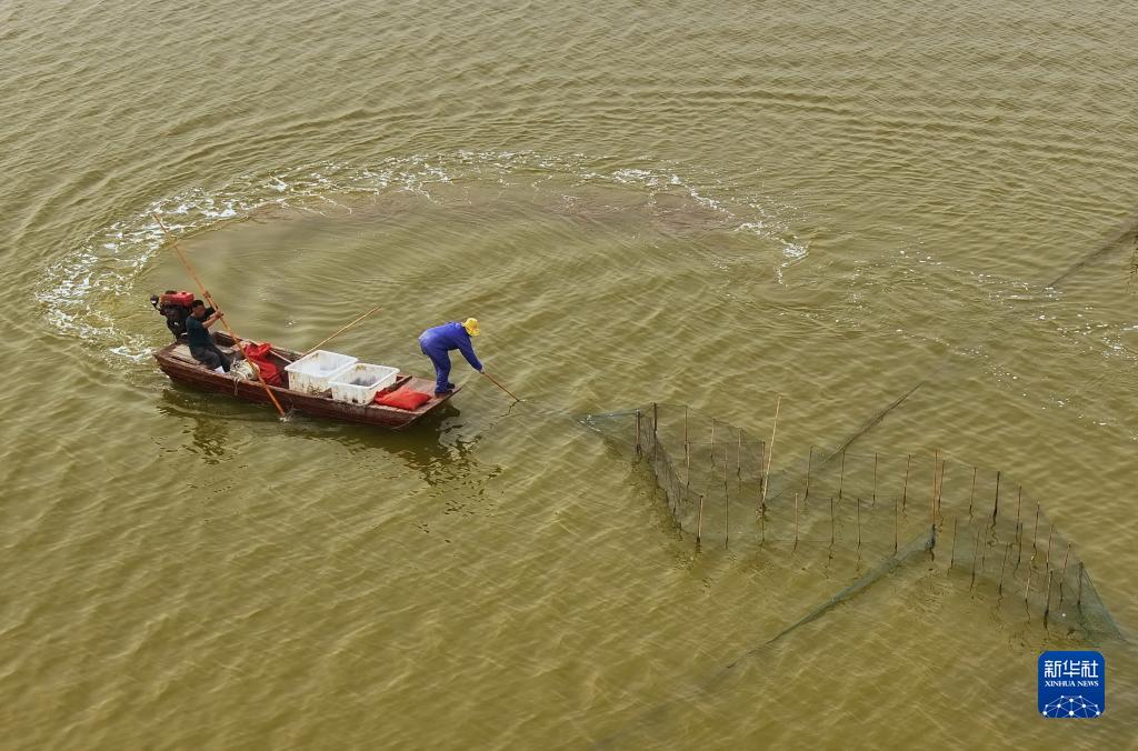 10月17日,在河北省唐山市曹妃甸區,水產(chǎn)養殖戶(hù)在捕撈利用鹽場(chǎng)鹽田鹵水養殖的南美白對蝦(無(wú)人機照片)。