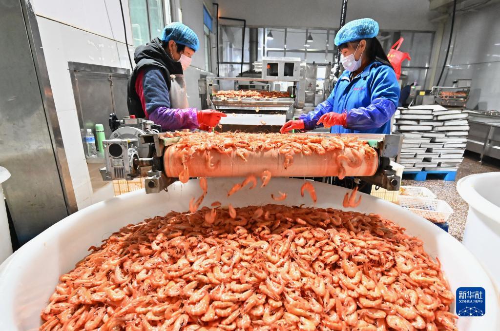 10月17日,工人在河北省唐山市曹妃甸區一家水產(chǎn)加工企業(yè)的南美白對蝦加工生產(chǎn)線(xiàn)上工作。