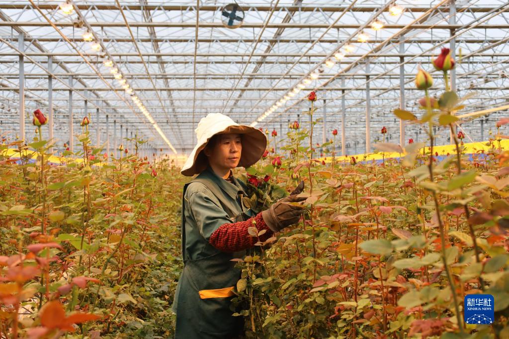 10月17日,在蘭州新區現代農業(yè)示范園花卉產(chǎn)業(yè)基地,務(wù)工人員采收玫瑰。