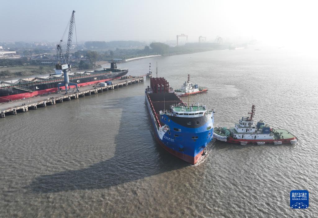 10月18日,中遠海運萬(wàn)噸級電動(dòng)集裝箱船離開(kāi)碼頭準備試航(無(wú)人機照片)。